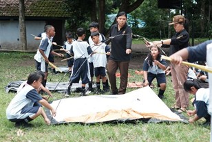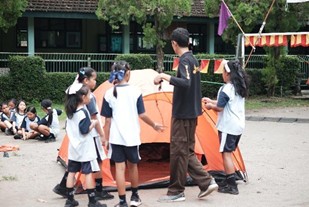 Usai upacara, suasana berubah menjadi riuh rendah penuh semangat. Lapangan belakang sekolah seketika berubah menjadi "deretan tenda". Dengan peluh yang bercucuran namun tetap ceria, anak-anak bekerja sama mendirikan tenda mereka masing-masing. Tak ada kata manja, semua bahu-membahu memastikan "rumah sementara" mereka berdiri kokoh.